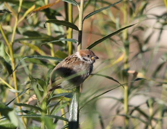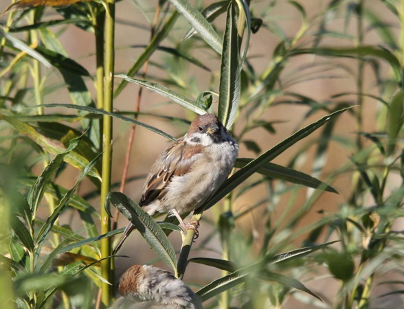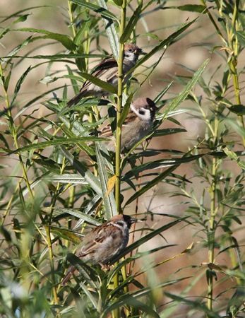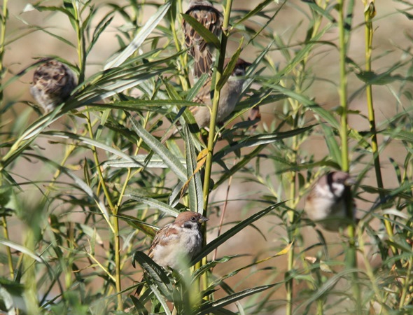 Podążałem pieszo za stadem mazurków, które zapadło w zielonej części placu. Cichutko skradałem się z ciężkim aparatem w ręku. Wystarczyło jednak, że butem zawadziłem o byle szeleszczącą reklamówkę i cała grupa ptaszków, jak z procy wystrzeliła do góry. Nie uciekły jednak daleko, szkoda porzucać takie miejsce. Przeleciały kilkanaście metrów, po czym wylądowały po drugiej stronie "wysypiskowego buszu". Taka sytuacja powtarzała się jeszcze wielokrotnie, ja jednak nadal cierpliwie podążałem za mazurkami z lewej strony do prawej i na odwrót. W końcu ptaki miały dosyć tych szachów i dyndając na wiotkich chwastach zajęły się codzienną toaletą upierzenia. Niektóre zaś zeskoczyły i bezpośrednio na ziemi poszukiwały pogubionych i wytrząśniętych z roślin nasionek. To była chwila dla mnie, czyli fotoreportera!