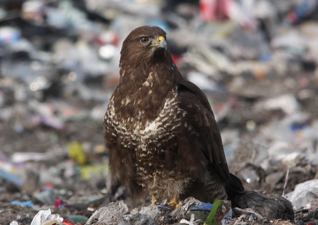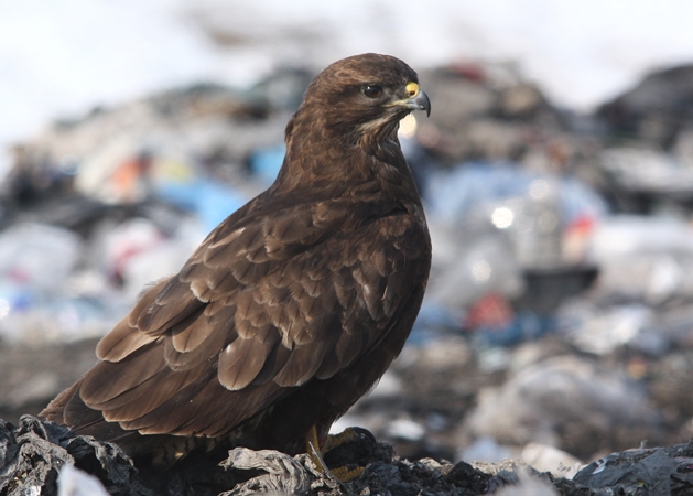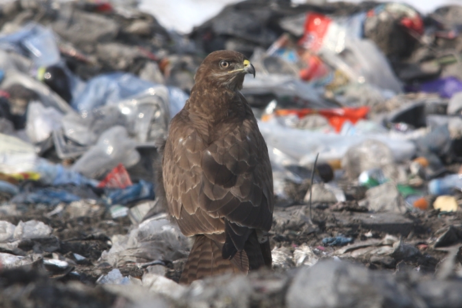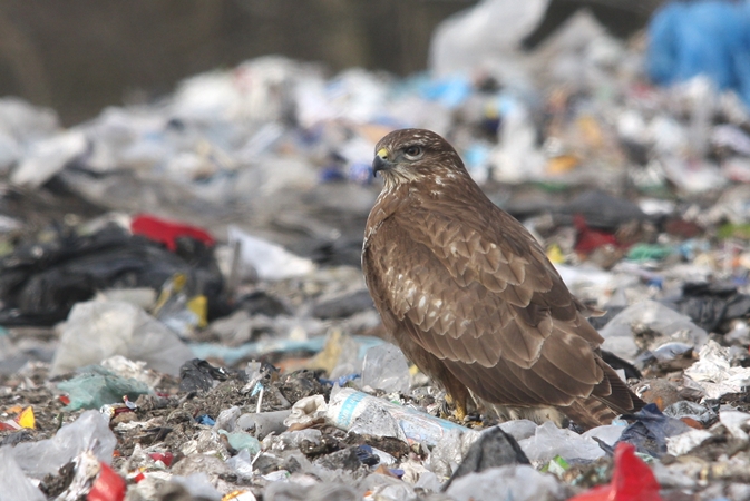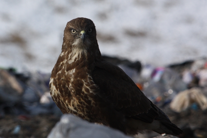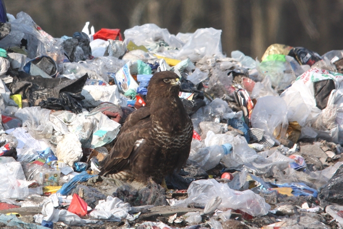 I siedzi taki myszołów napuszony, nieruchomy, trochę zdezorientowany... Nie za bardzo jest w co wbić szpony i w czym zatopić swój haczykowaty dziób. Teraz to już mniej myszołów, to bardziej kura na grzędzie. Cała nadzieja bowiem na wysypisku śmieci. Teren ZUOK-u w takich okresach jest oblegany przez myszołowy, które ściągają w tym kierunku bardzo chętnie z nadzieją na lepsze jutro.