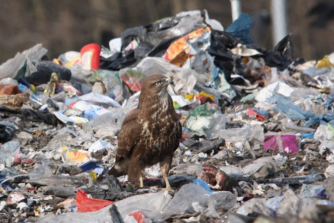Może myszołów skorzystać z gościnności i dóbr wszelakich "stołu wysypiska". Trzeba jednak innej strategii i innego podejścia. Trzeba wyzbyć się poczucia swojej siły i mocy. Trzeba z króla przestworzy przeobrazić się w przyczajoną kurę. Wskoczyć gdzieś ukradkiem, bokiem, jak chytrus, niczym złodziej. Szybko, nie drażnić czujnych oczu kruków, kawek i wron siwych, nie narzucać się, nie pokazywać. Wyłonić się gdzieś z lasu i czatować w koronach drzew na dogodną okazję, na jakaś chwilę nieuwagi...Wówczas jeden sus, jeden skok... pstryk - myk... i już na plac. Tam już jest łatwiej wmieszać w krajobraz kolorowych hałd śmieciowych. Teraz już myszołów może grzebać, przebierać, kopać, ... aby się do czegoś dokopać. Jest nadzieja i jest szansa na jakieś znalezisko. Czasami tez warto skorzystać z zamieszania. Jakiś fałszywy alarm, ogólna panika na placu, kruki tracą na dłuższy czas kontrolę i panowanie nad terenem. W takich przypadkach liczy się własna skóra, własny byt. Krukowate ewakuują się na jakiś czas, odczekują dłuższy okres w przyczajeniu zachowując wszelkie wymogi kruczego bezpieczeństwa. Nawet jeśli zagrożenie się oddali ptaki z dystansem podchodzą do zbyt pochopnego powrotu. To dla myszołowów szansa na przejęcie inicjatywy. Teraz to one mogą przez chwilę hulać po śmieciach bez towarzystwa czarnych ptaków.