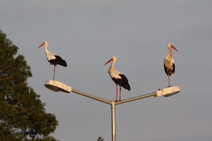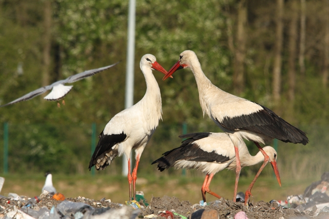 Leżąc wśród odpadów inaczej postrzega się ptaki, można zobaczyć zupełnie inny charakter stworzenia, zupełnie inną „twarz” (jeżeli przy skrzydlatych istotach w ogóle można się tak wyrazić). Tu na śmieciach bocian biały już raczej nie jest biały – to zdecydowanie bocian… szary. Piękny, wypracowany przez lata, symboliczny i pomnikowy wręcz wizerunek kroczącego dumnie ptaka w naszych barwach narodowych pośród malowniczych łąk zielonych, pól malowanych zbożem rozmaitem itd., tym razem lekko się deformuje niczym w krzywym zwierciadle. Tu przy odpadach brudne bociany biegają jak kury. Wyciągają i wygrzebują niezbyt apetyczne, przegniłe i nieświeże pozostałości z naszych stołów. W dzikim, ślepym amoku możliwości pozyskania łatwej zdobyczy rozrywają swoimi dziobami foliowe worki i łapczywie łykają plastry wędlin, kawałki kiełbas, serów i co im tam jeszcze w dziób wpadnie: a to kawałek kurczaka, jakieś zlewki, sosy. Bociany umorusane, zachłanne, mało płochliwe. Bardziej tu przypominają jakieś sępy przy padlinie, niż dostojne wiejskie, znane z obrazków i malowideł, ptaki. W dodatku ściągają na wysypisko gromadnie, czasami nawet na niewielkim 30 ha placu tłoczy się ponad setka amatorów śmieciowej jadłodajni. Spłoszone ptaszyska krążą nad placem bądź przenoszą się na okoliczne latarnie, słupy, dachy zakładowych budynków. Większość też w taki sposób nocuje zupełnie nie opuszczając obszaru wysypiska. Prawdopodobnie głównymi beneficjentami życia w tym „śmieciowym raju” są bociany młode i nielęgowe, które grupując się w takich miejscach korzystają z trochę łatwiejszego życia. Na terenie zakładu na stelażu budynku kompostowni pojedyncze pary nawet próbują nieśmiało znosić materiał i konstruować trochę nieporadnie gniazda. Stoją później uparcie i dumnie w tych swoich skąpych konstrukcjach imitując trochę rodzinne zachowania. W ubiegłym roku były dwa takie „pół-gniazda”, w tym roku już cztery pary urządziły sobie taki poligon doświadczalny. Instynkt budowania i zakładania gniazda dochodzi do głosu. Mam nadzieję, że w przyszłym sezonie o rok mądrzejsze i podbudowane swoim zakładowym doświadczeniem boćki założą właściwe gniazdo już w zdecydowanie bardziej dogodnym miejscu, tam gdzie statystyczny, krajowy bocian powinien się ze swoją konstrukcją rozlokować.