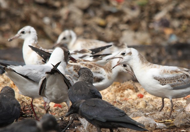 Ten z kolei zastawiał się łapczywie i wskakiwał na bułkę zaznaczając swoją dominację. Też się jednak spieszył, bo za chwilę mógł się pojawić równie władny konkurent. I tak się też stało, tylko zamiast kolejnej kawki do bułeczki już podkradały się dwa gawrony i jedna wrona siwa. Argumenty siły, rozmiarów i mocy były skuteczne. Kawki już tylko z dystansu obserwowały dalszy bieg wydarzeń. Gawrony się dobrały do suchej bułki, waląc w nią dziobami i skutecznie rozkruszając. Wrona siwa też chciała się dosiąść, ale nie zdążyła. Nad hałdą pojawiły się bowiem stada rozwrzeszczanych, białych ptaków. Mewy zanęcone widokiem ucztujących ptaków ruszyły do bezwzględnej ofensywy. Początkowo w liczbie kilkudziesięciu śmieszek. Niczym desant spadochroniarzy opadały miarowo i po kolei siejąc prawdziwy zamęt. Zgiełk, hałas, szybkość, dynamika - to przerosło pozostałych ucztujących. Mewy rzuciły się na podziobaną już bułkę i ... szybko ją odrzuciły w popłochu. Całe ptasie towarzystwo poderwało się w panicznym popłochu. Nadjeżdżająca ciężarówka wprowadziła przymusowy i zapewne krótkotrwały rozejm. A bułki już tylko pół...