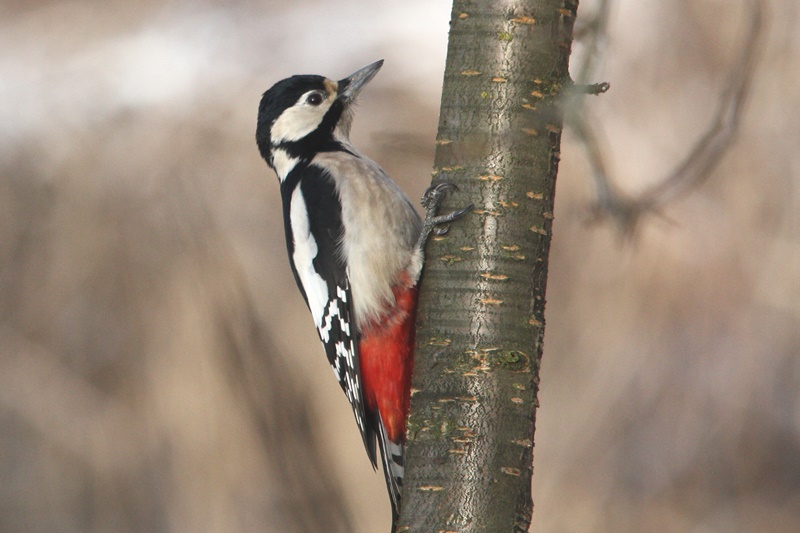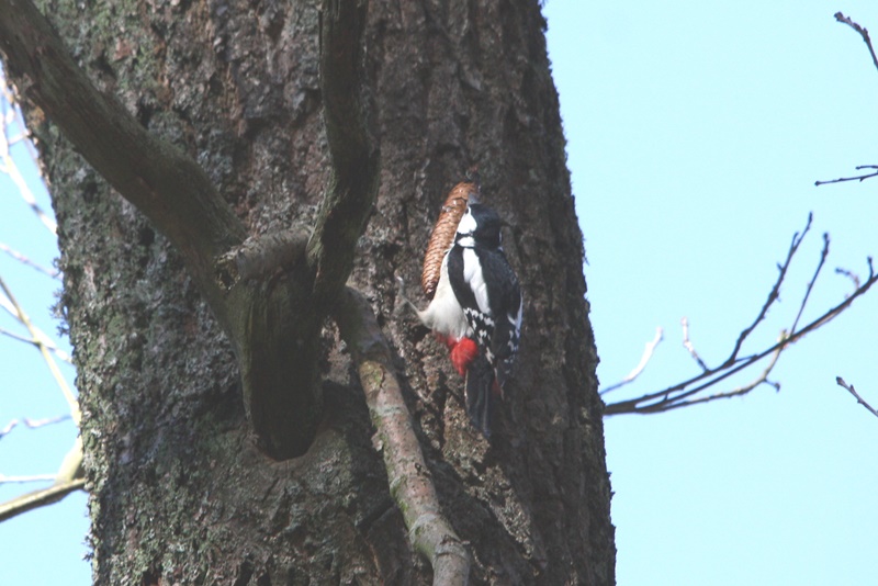 W każdym razie wiosenna aktywność dzięciołów jest widoczna w ZOUK-u. Okalające plac wysokie drzewa i sąsiedztwo lasu to wystarczające argumenty dla tych ptaków, żeby się od czasu do czasu pojawiały w tym miejscu. Nad placem przelatują tylko niczym strzały zmieniając sobie drzewostan i miejsca żerowania. Poszukują też oczywiście partnerów. To jest w końcu wiosna, a o tej porze roku samotność może bardziej doskwierać nie tylko człowiekowi. Trzeba się spieszyć, obowiązków każdy dzięcioł wiosenną porą ma co nie miara. A to zaloty, a to walka z konkurencją, a to wyznaczenie terytorium, a to kucie dziupli… trzeba być bardzo zdyscyplinowanym, wytrwałym, ambitnym i pracowitym, aby wypełnić wszelkie powinności przeciętnego dzięcioła. Zwykle staram się brać przykład z tych ptaków i snując życiowe plany ustawiam sobie poprzeczkę na podobnym poziomie, jednak już każdego leniwego ranka strącam ją z pełną determinacją. No cóż, gdzie mi tam do dzięcioła, a szczególnie do dzięcioła dużego…