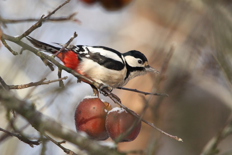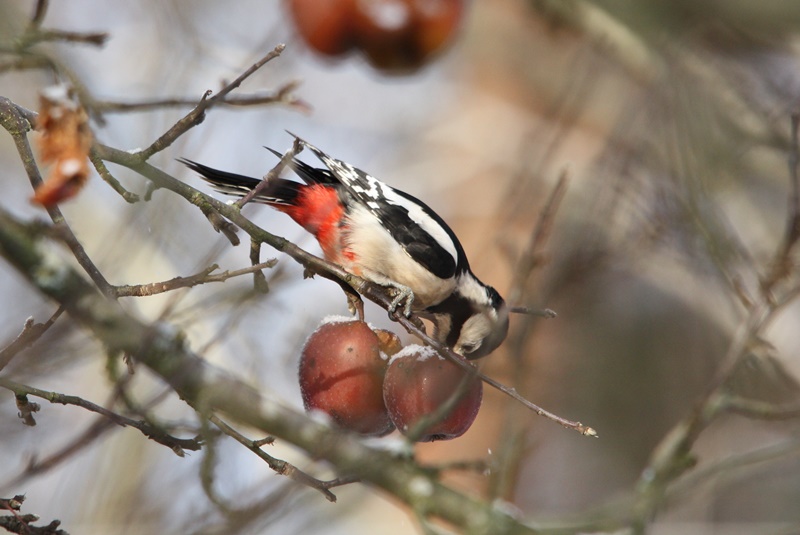 Drugi czynnik to dosyć bogate, urozmaicone i szerokie menu. Dzięcioł duży nie grymasi i to wychodzi mu jak najbardziej na plus. Oczywiście, jak przystało na dzięcioły, podstawowym pokarmem są owady i ich larwy wydłubywane i wyciągane z drewna. Jednak gdy ogranicza się dostęp do tego pożywienia to bez trudu przestawia się na inne pożywienie. A jest tego całkiem dużo: nasiona szyszek, owoce, a nawet padlina. W dodatki może odwiedzać nasze karmnik, gdzie pałaszuję słoninę, czy przydomowe ogródki w celu konsumpcji pozostawionych na drzewkach jabłek. Jeżeli jeszcze do tego dołączymy zupełnie wymyślne „potrawy” takie jak: mszyce, sok spijany z brzóz, pisklęta i jaja innych ptaków to wyciągniemy z tego jedną i konstruktywną konkluzję – dzięcioł duży nie jest wybredny!!!
